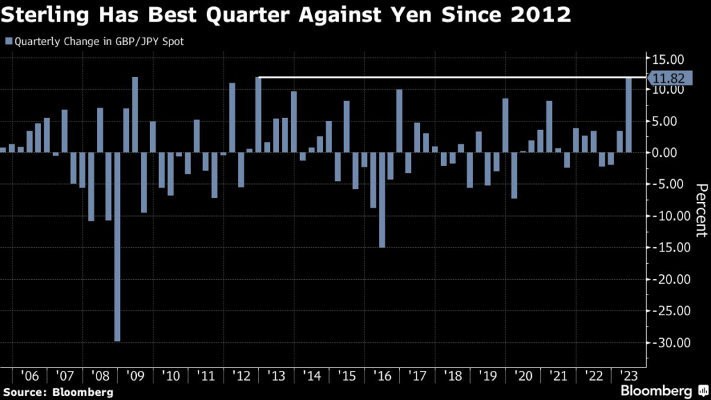 Against the yen, the worst performer in the second quarter, the pound scored its biggest advance in more than a decade, climbing 12% as the Bank of Japan kept its monetary policy ultra loose.