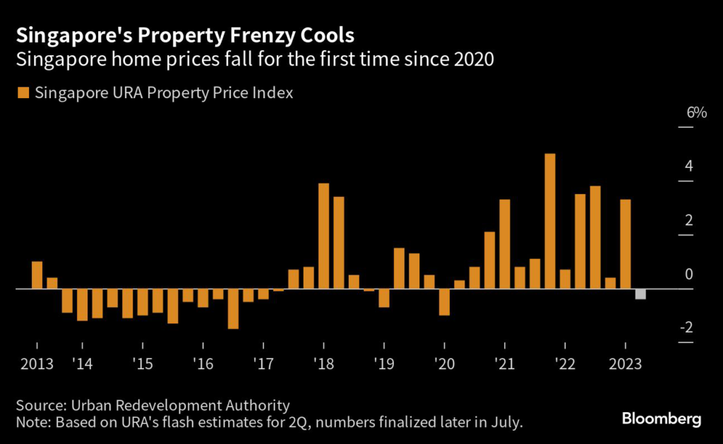 (Bloomberg) — Singapore home prices fell for the first time in three years in the second quarter, suggesting the market is cooling on the back of the latest property curbs.