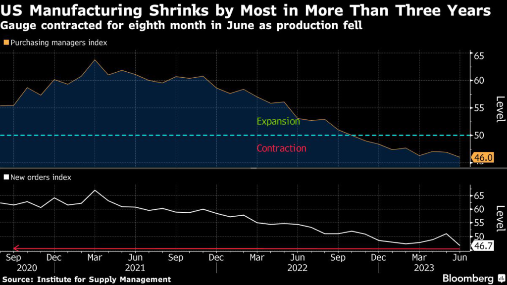 (Bloomberg) — US factory activity contracted for an eighth month in June, slipping to the weakest level in more than three years as production, employment and input prices retreated.
