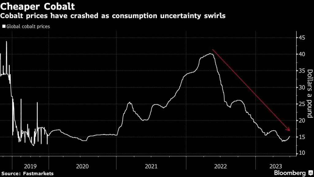 Global cobalt prices have tumbled more than 60% from May 2022 on rising output from the Democratic Republic of Congo and Indonesia.