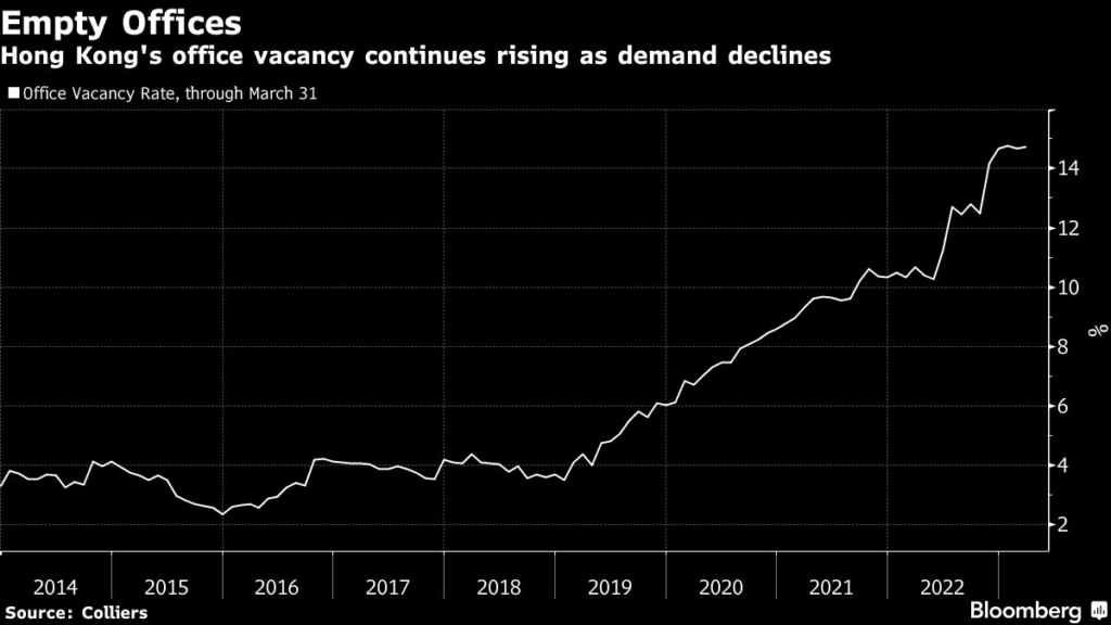 The overall grade A vacancy rate in Hong Kong was almost 15% in April, more than three times higher than in 2019, according to Colliers International Group Inc. On top, the prestigious financial district of Central has seen a surge in supply for the first time in more than a decade.