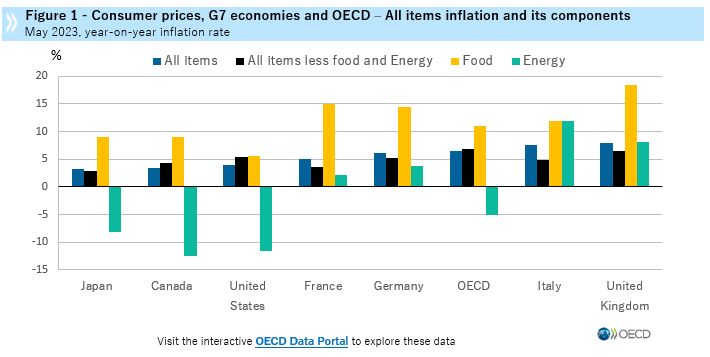 All members of the club have seen slowing inflation apart from the Netherlands, Norway, and the UK, the OECD said. In the Group of Seven it is now at 4.6%, the lowest since September 2021.