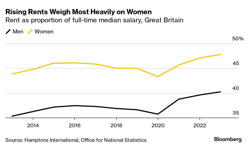 Rents eat up almost half of a woman’s salary around Great Britain, compared to 40% for a man. The disparity grows in the capital.