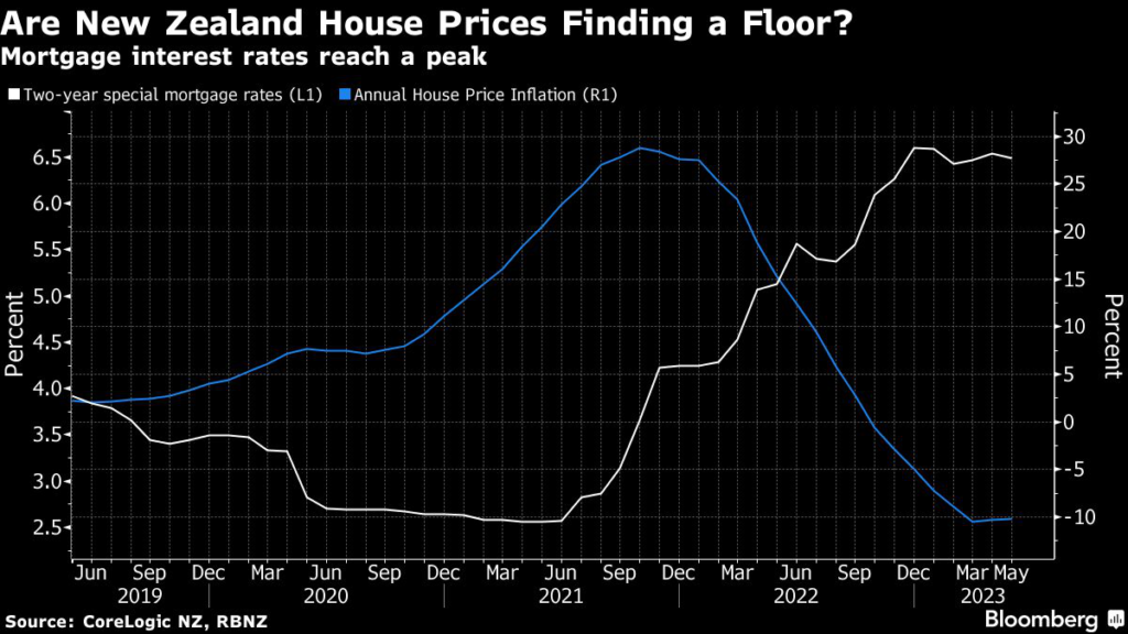(Bloomberg) — New Zealand house prices fell by the most in eight months in June, showing the market has yet to find a floor even as interest rates reach their peak.