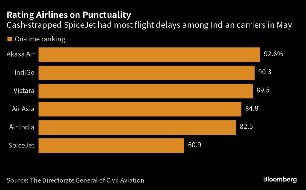 SpiceJet, which is operating about 250 flights a day, isn’t alone. Air India Ltd., the nation’s second-largest carrier, slid to fifth from second in the punctuality ranks, with almost twice as many flight delays in May as a month earlier.
