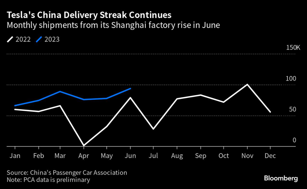 (Bloomberg) — Tesla Inc.’s China output increased almost 20% in June, contributing to the company’s record quarterly sales.