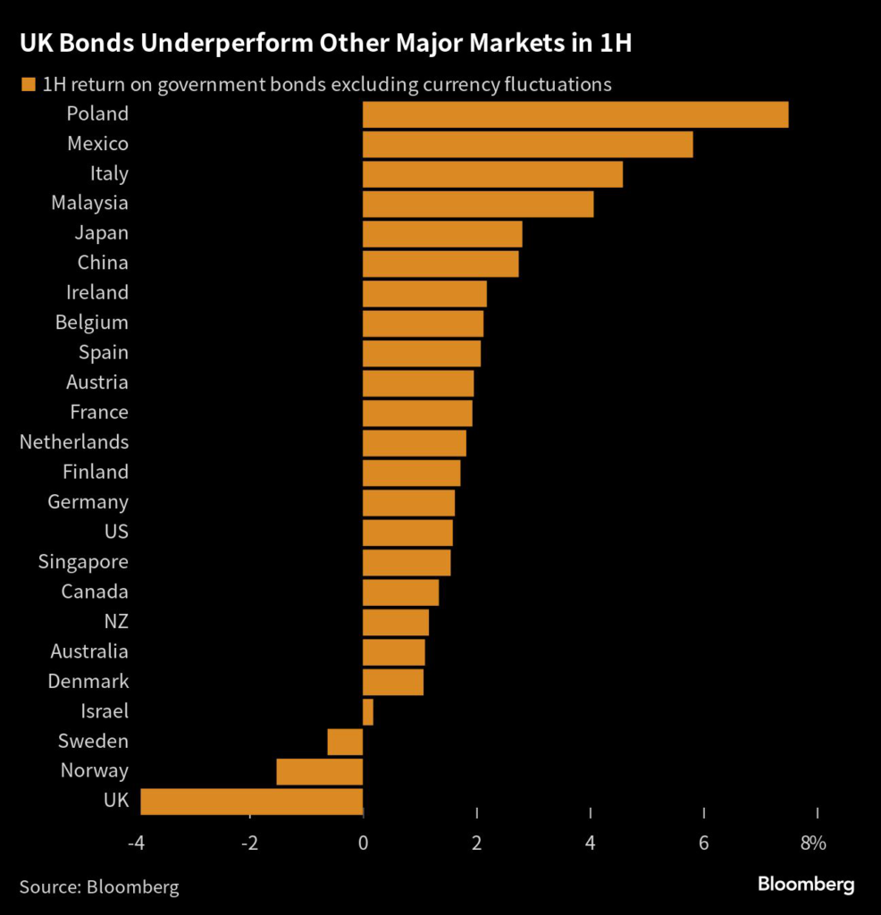 Gilts were the worst performers among major government bond markets in the first half as the Bank of England raised its key rate by 1.5% points to 5%.