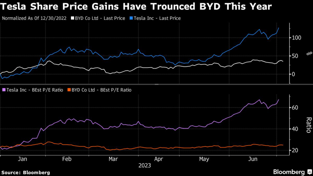 Tesla trades at 67.4 times forward earnings, compared with 24.8 times for BYD.