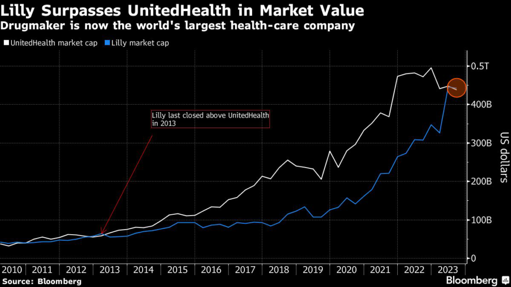 Eli Lilly & Co. became the world’s biggest health-care company by market value, surging ahead of health insurance giant UnitedHealth Group Inc.