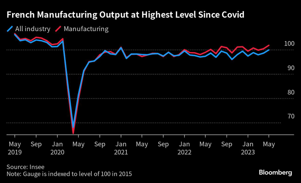 French manufacturing output rebounded unexpectedly in May to reach the highest level since before the Covid pandemic, easing concerns of a short-term slump in the euro area’s second-largest economy.
