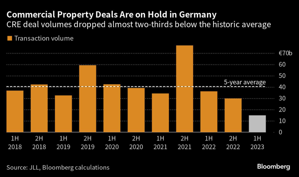 Germany’s market for commercial real estate plunged to the lowest level since at least 2017 in the latest sign of the turmoil triggered by soaring interest rates.