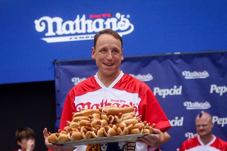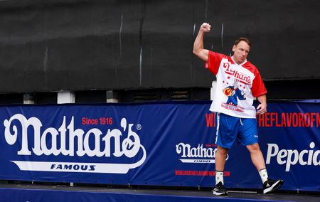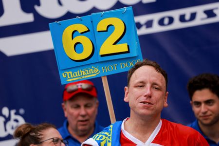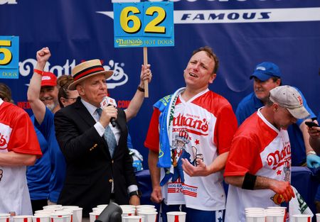 (Reuters) – Reigning champion of the annual U.S. Fourth of July hot dog eating contest Joey Chestnut defended his title on Tuesday, clinching his 16th career win by scarfing down 62 franks in 10 minutes.
