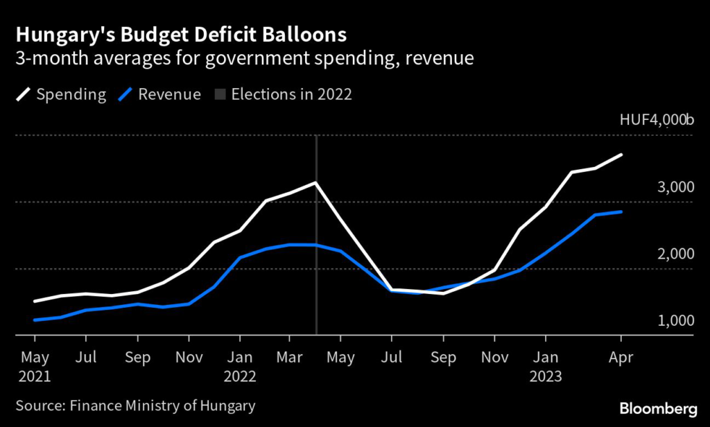 Hungary racked up a record shortfall in the first five months of the year as the fastest inflation and highest borrowing costs in the EU battered consumption and revenue, especially value-added taxes that have anchored inflows.
