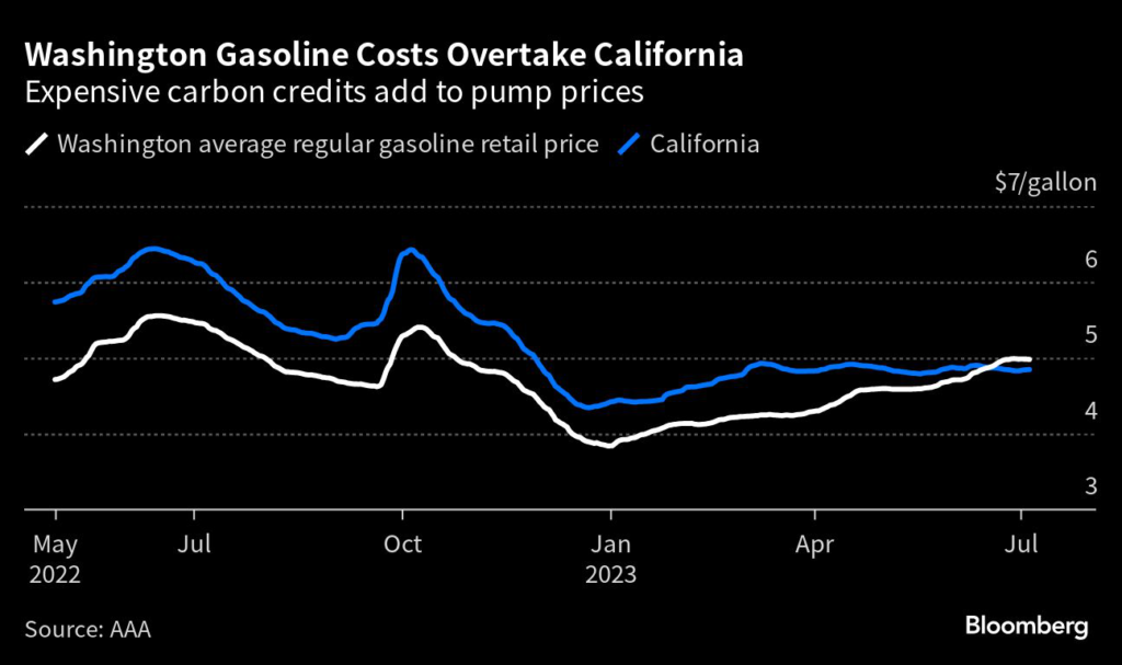 Washington gasoline prices have surpassed those of California to become the most expensive in the country as drivers there bear the brunt of the state’s effort to cut carbon emissions.