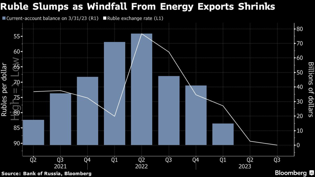 The ruble has grown more vulnerable after a deterioration in Russia’s external finances. Unlike last year, when the government earned a record windfall after a rally in commodity prices, export proceeds have fallen sharply in 2023.