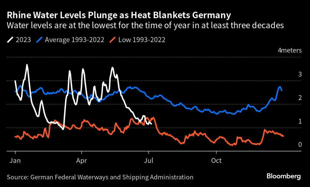 Rhine River water levels are on track to fall to critically low levels again this summer, as extreme heat scorches parts of Europe, testing energy and transport networks.