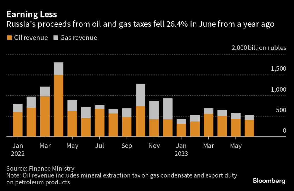 (Bloomberg) — Russia’s oil and gas revenue shrank by over a quarter last month amid lower crude prices and capped gas flows to Europe.