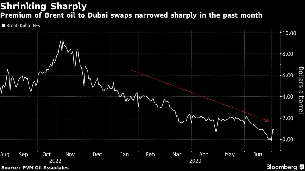 The spread between two crude benchmarks Brent and Dubai has also narrowed sharply in the past month, indicating that Brent-linked crude could be more appealing.