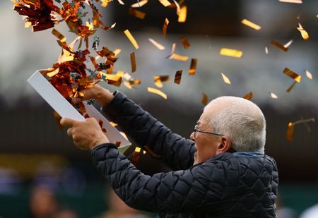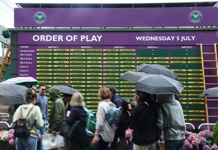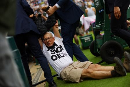 LONDON (Reuters) -Just Stop Oil protesters twice interrupted play on the third day of Wimbledon on Wednesday, releasing orange ticker-tape mixed with jigsaw puzzle pieces during matches on Court 18.