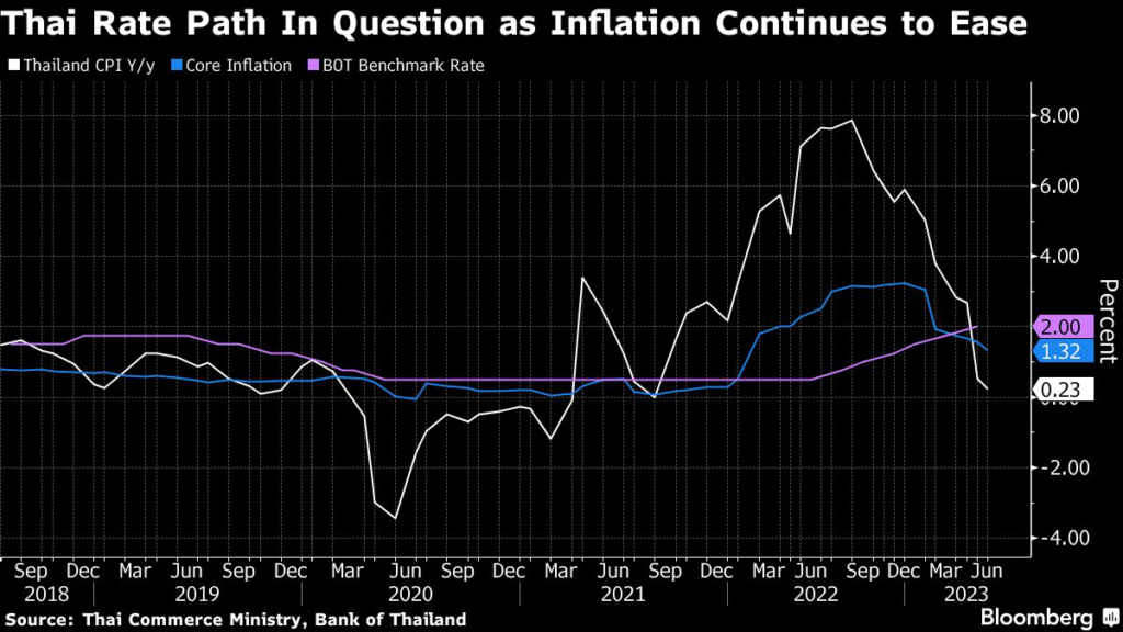 Still, the latest set of benign inflation readings gives Bank of Thailand greater leeway to pause rate hikes when it meets again on Aug.
