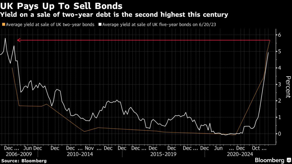 (Bloomberg) — The UK sold £4 billion ($5.1 billion) of gilts at the highest yield in 16 years on Wednesday, underscoring the elevated returns governments must offer to lure investors after more than a year of interest-rate hikes.
