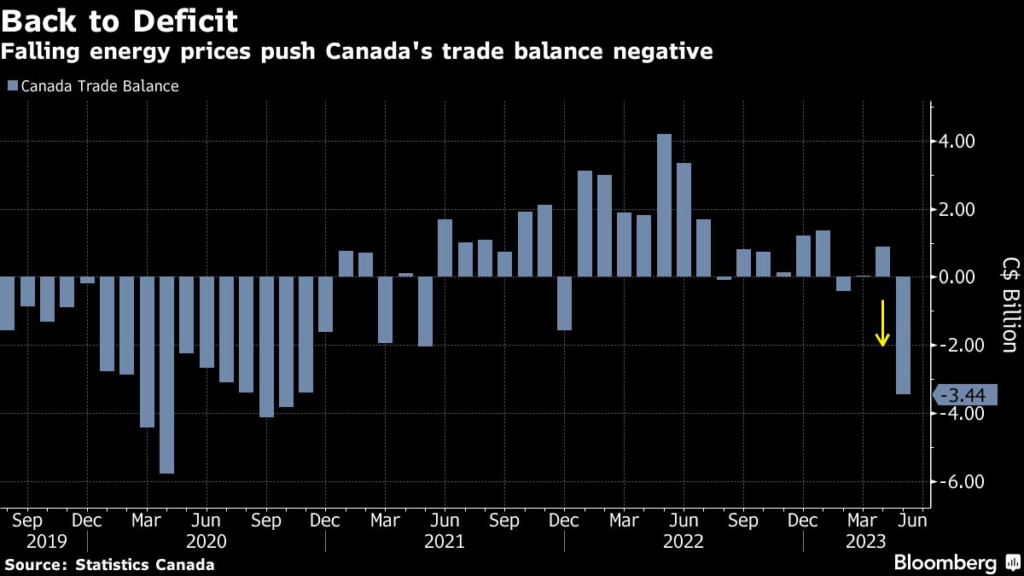 (Bloomberg) — Canada’s merchandise trade balance unexpectedly recorded its largest deficit since October 2020, in large part due to lower energy prices.