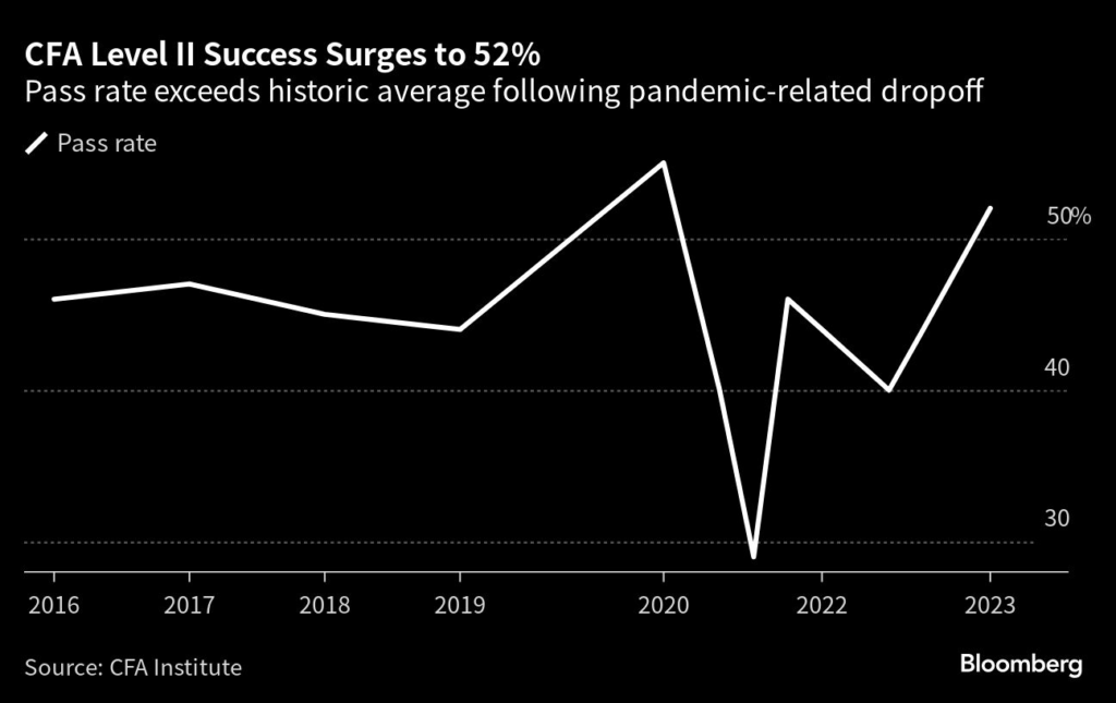 (Bloomberg) — The pass rate for the second level of the chartered financial analyst exam surged past its historic average, marking a comeback from the dip caused by pandemic-related disruptions to test-taking.