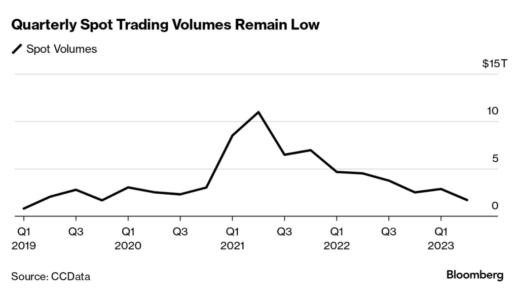 (Bloomberg) — Trading volume on cryptocurrency exchanges in the three months ended in June was the lowest since the final quarter of 2019 despite a jump in activity during the final weeks of last month.