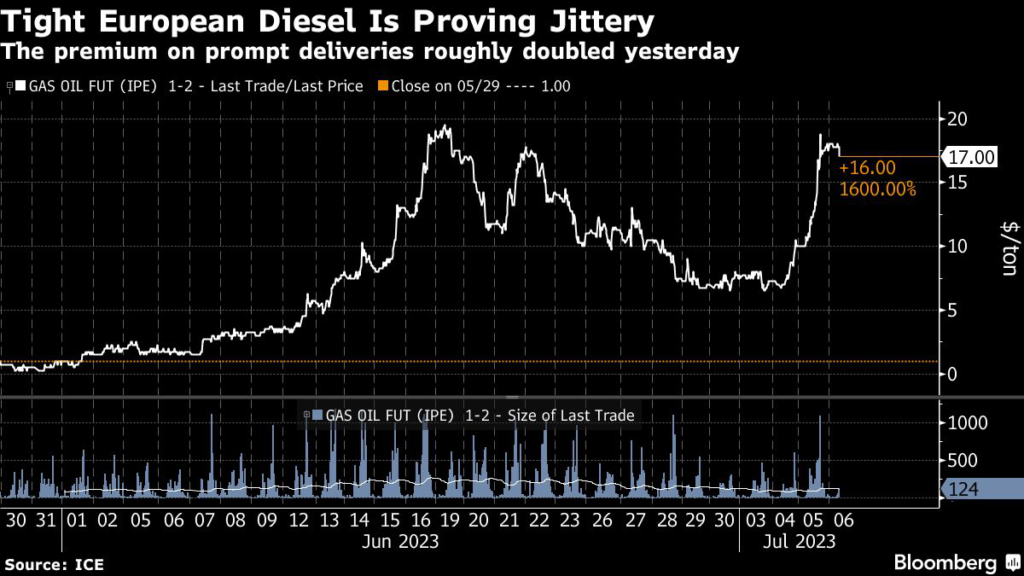 (Bloomberg) — Europe’s diesel market is starting to spike, underscoring its vulnerability to supply disruptions since cutting off imports from top supplier Russia earlier this year.