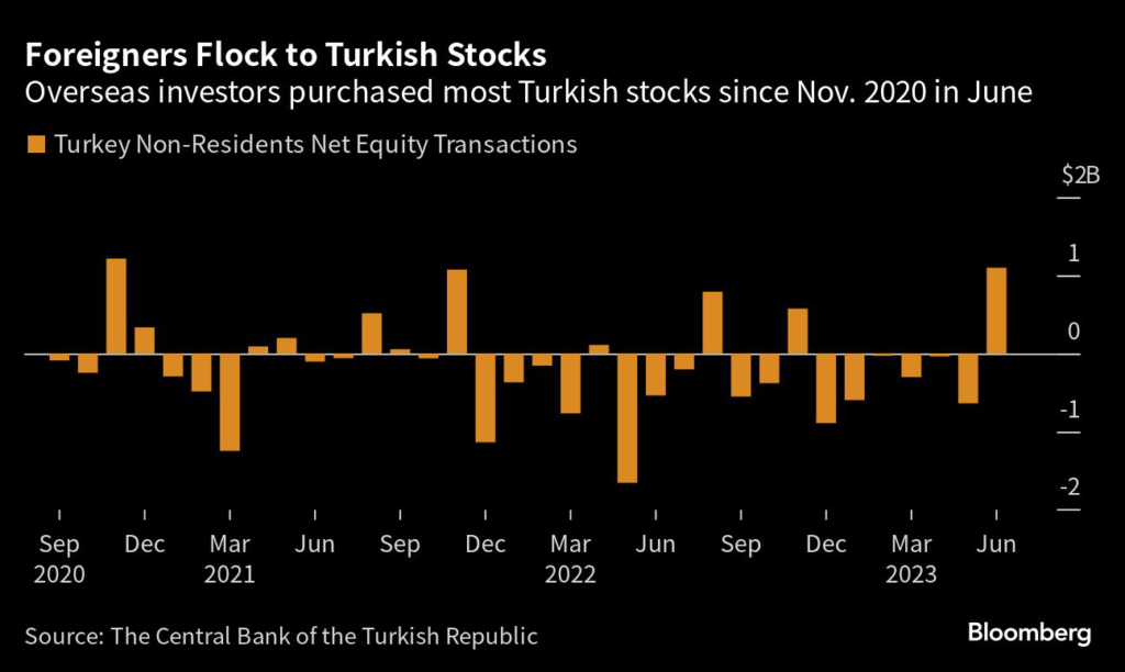 (Bloomberg) — Overseas investors bought up Turkish equities at the fastest pace in 31 months since June on hopes for a return to more orthodox economic policies.