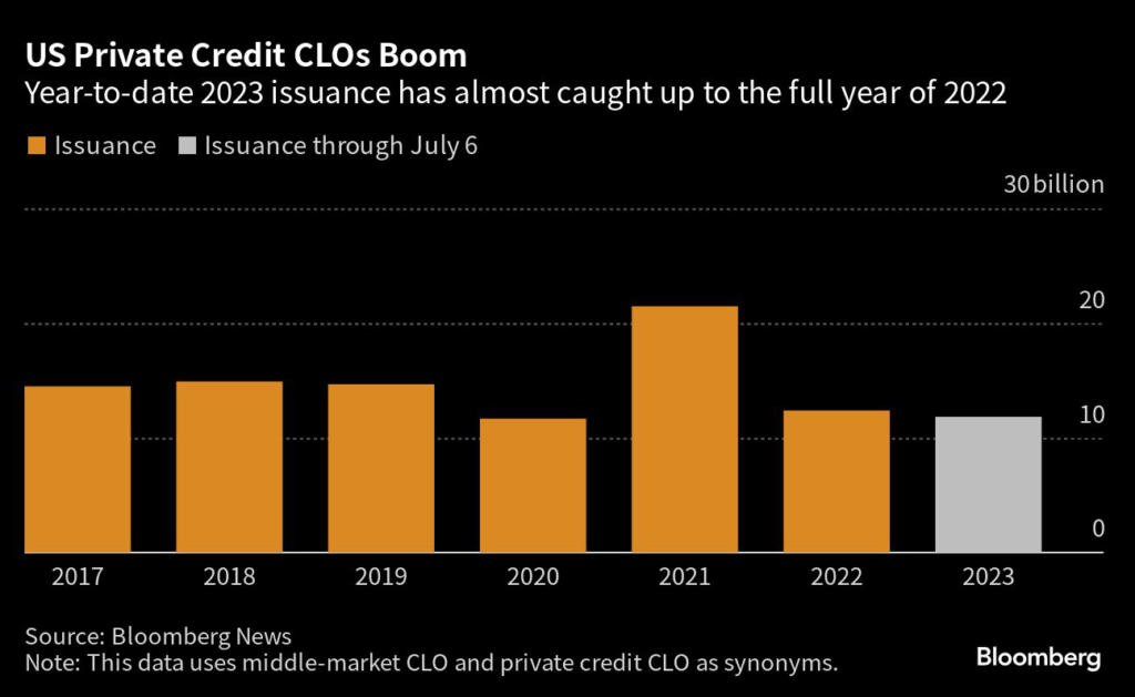 Issuance of private credit or middle-market CLOs in the US has ballooned to more than $11.8 billion so far this year, almost matching the total for all of 2022, according to data compiled by Bloomberg News.