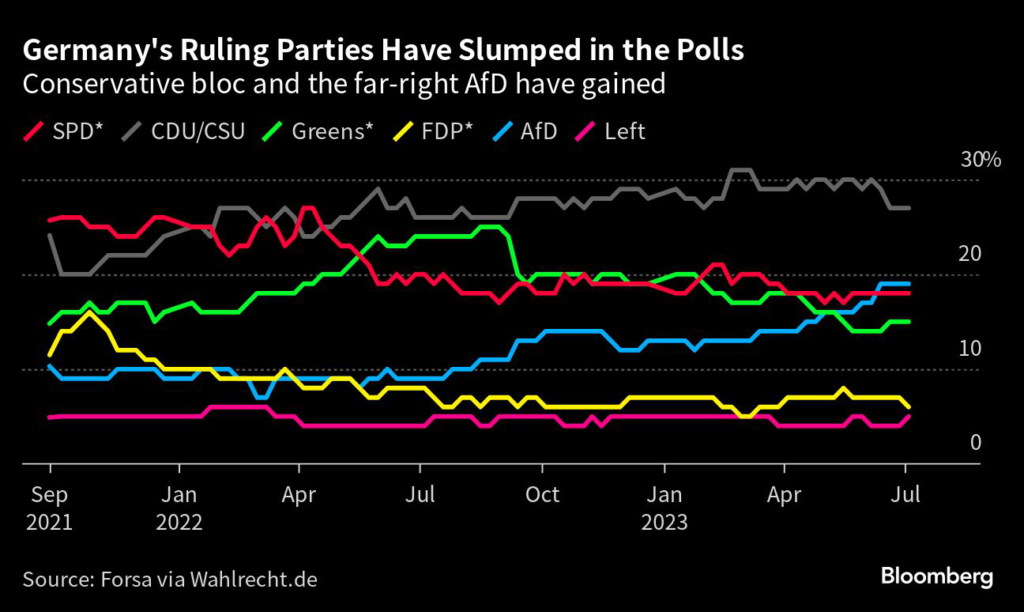It could also further fuel voter frustration. Support for the governing parties has dwindled to a combined 39%, with all three below the Christian Democrat-led conservatives and the far-right Alternative for Germany, according to a poll published by Forsa this week.