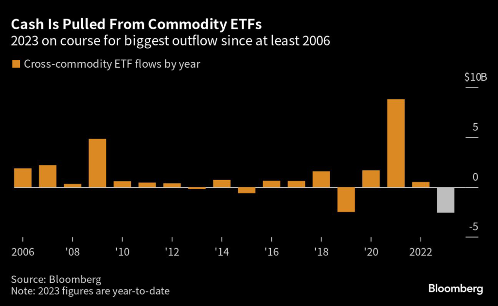 A basket of 16 cross-commodity ETFs is on track for its biggest annual outflow since at least 2006, according to data compiled by Bloomberg.