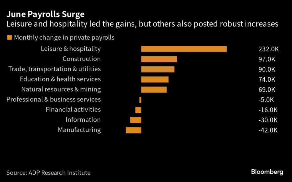 US companies added almost half a million jobs last month, the most in over a year, according to data from ADP Research Institute in collaboration with Stanford Digital Economy Lab.