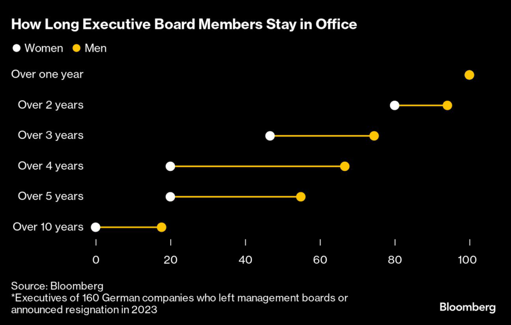 While men stay on average more than five and a half years in a C-suite job, women who have resigned from German management boards or announced their departure since the beginning of this year had spent on average less than three years in their position.