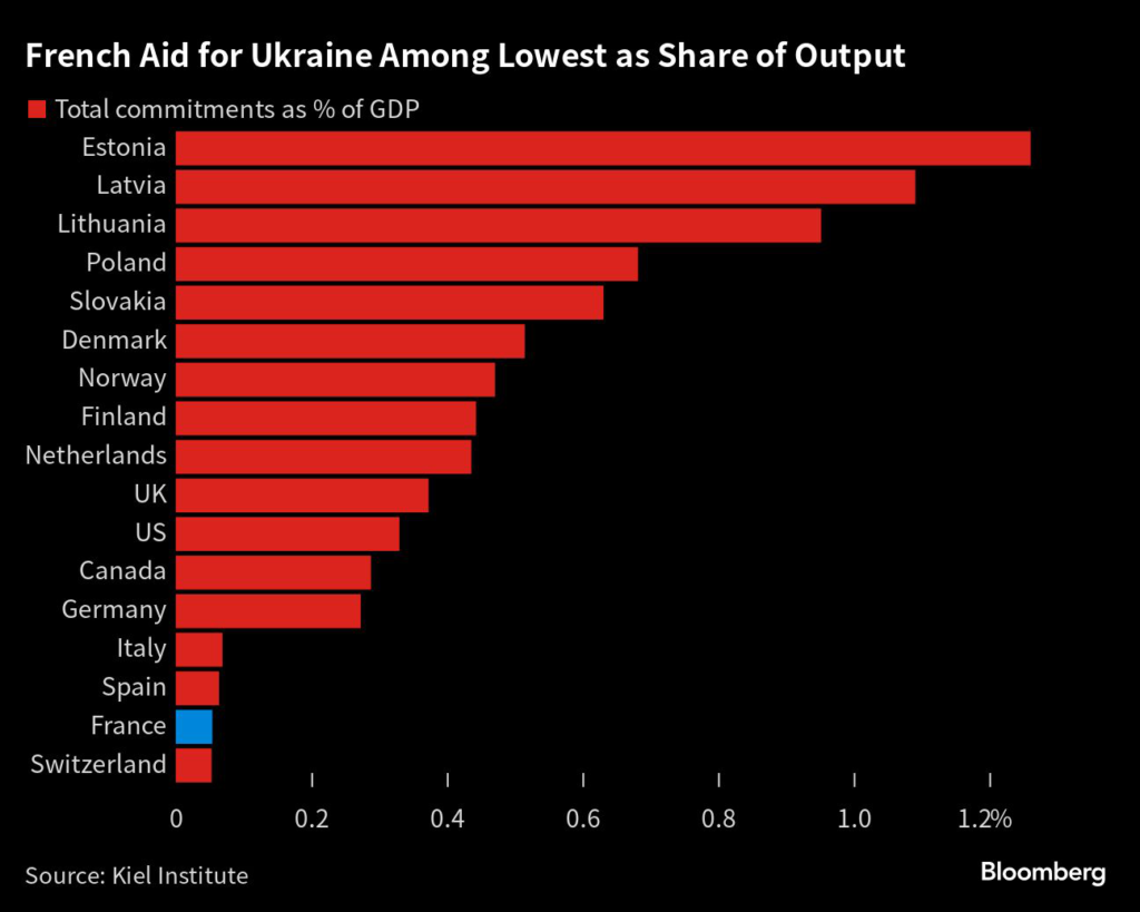 French aid to Ukraine so far is equivalent to 0.3% of GDP, according to the Ukraine Support Tracker from the Kiel Institute for the World Economy.