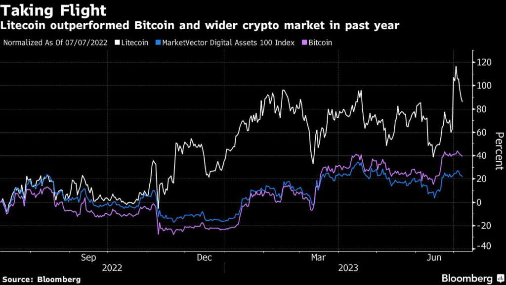 (Bloomberg) — Bitcoin investors are drawing succor from a surge in the smaller token Litecoin over the past year that has outstripped the broader crypto market.