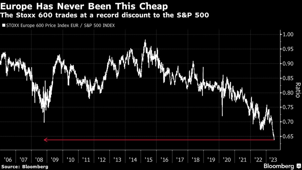 (Bloomberg) — European stocks are the cheapest they’ve ever been compared with their US peers, according to Citigroup Inc.