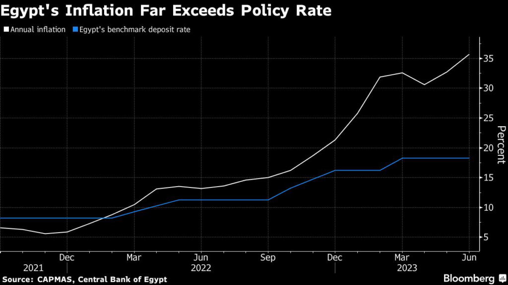 (Bloomberg) — Consumer prices in Egypt soared at a record pace, a reflection of pressures on food costs after the Muslim feast holiday and a pick-up in summer spending.