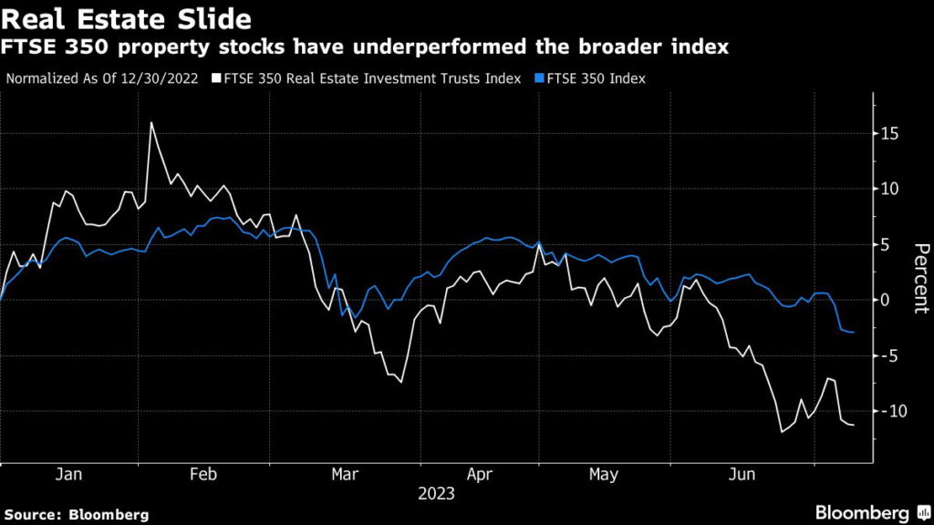 The sector has struggled this year, with a FTSE index tracking real estate investment trusts down almost 12% as the cost of borrowing has surged — ending more than a decade of cheap money that inflated asset values.