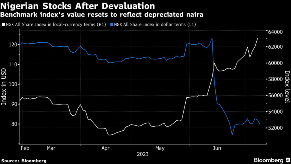 Overseas investment flows have jumped over the past month after incoming President Bola Tinubu’s administration allowed the naira to weaken 40%, according to data from the Nigerian Exchange in Lagos.