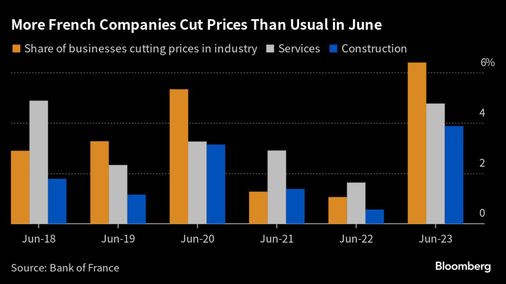 Only 8% of industrial companies imposed increases in June, the lowest proportion in more than two years, according to the Bank of France’s monthly survey of 8,500 businesses.