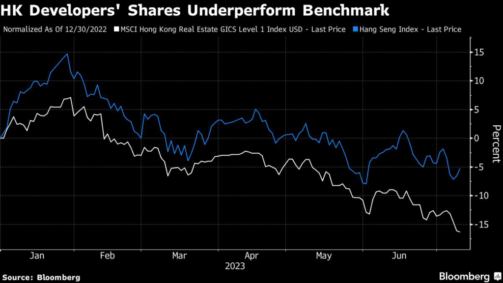 A MSCI gauge tracking Hong Kong developers has lost more than 16% year-to-date, underperforming the benchmark Hang Seng Index which is down about 5%.