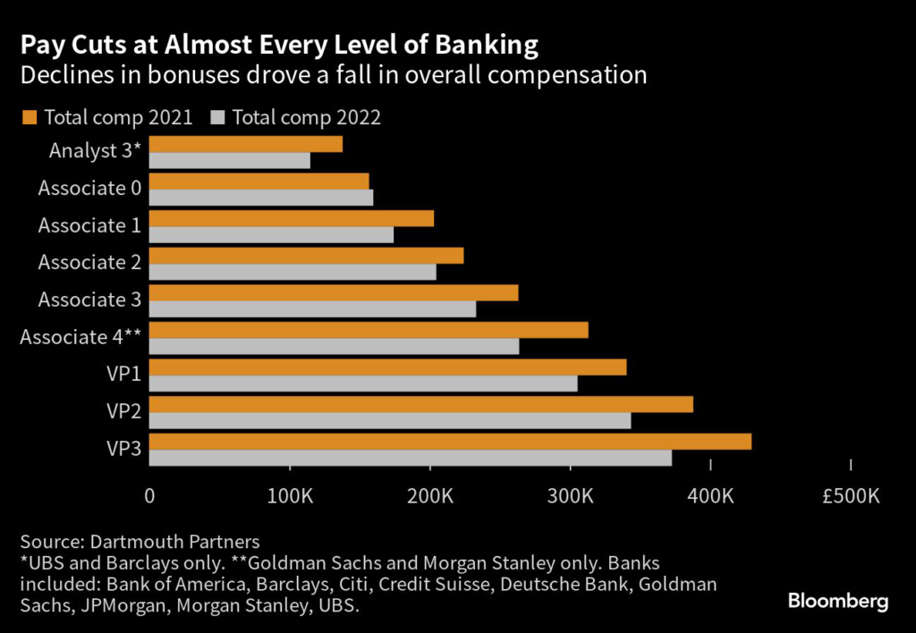 In the UK, remuneration at Goldman Sachs — the best-paying investment bank in 2021 — fell the hardest in 2022, with associates’ total compensation down 28% and VP pay falling almost 25%, according to Dartmouth.