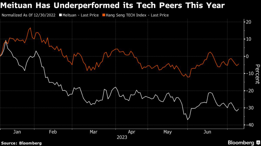 Through Monday’s close in Hong Kong, Meituan’s decline was more than six times that of the tech gauge and it has slumped about three quarters from a record high close set in February 2021.