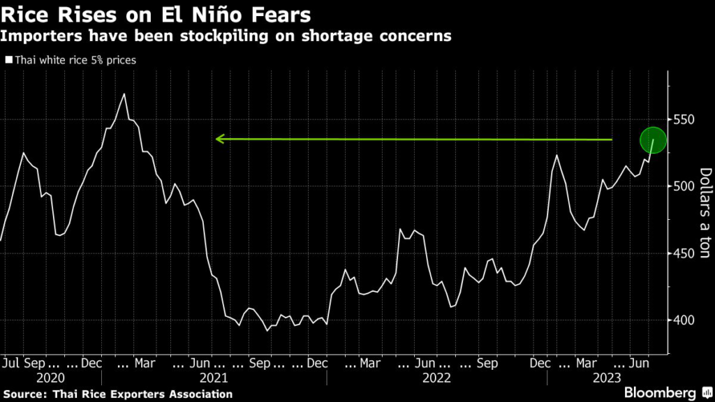 (Bloomberg) — Rice prices in Asia have surged to the highest level in more than two years as importers build up stockpiles on fears that the onset of El Niño will parch plantations and damage crops.