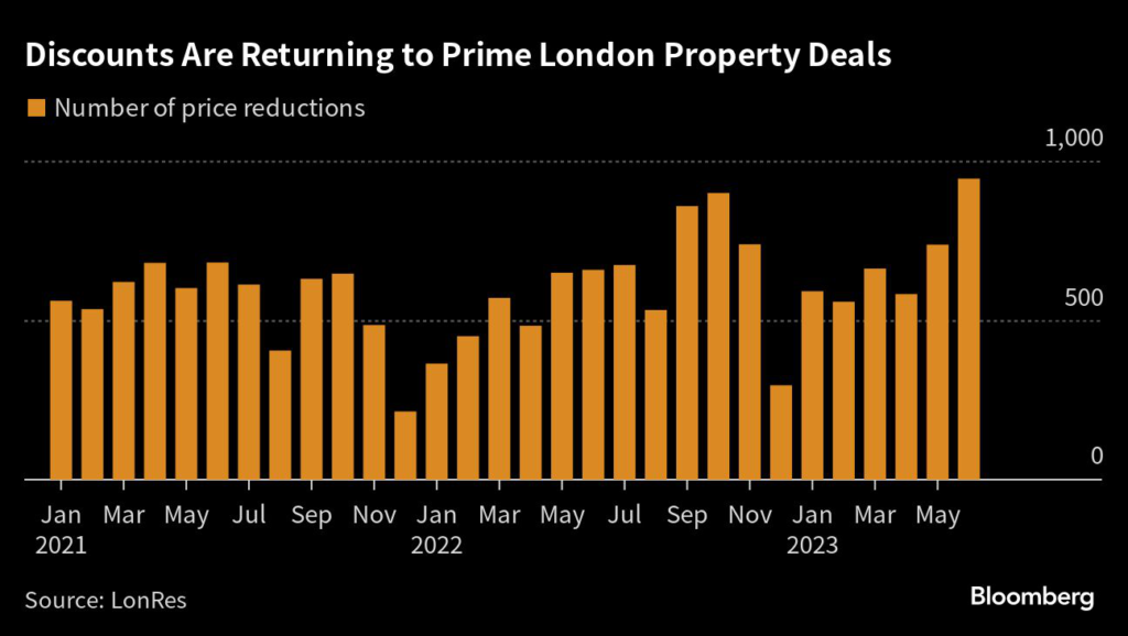 Still, the number of prime London properties going under offer in June — billed as a leading sales indicator by LonRes — was 6.3% higher than the same month in 2022, signalling a potential uptick in deals later this year.