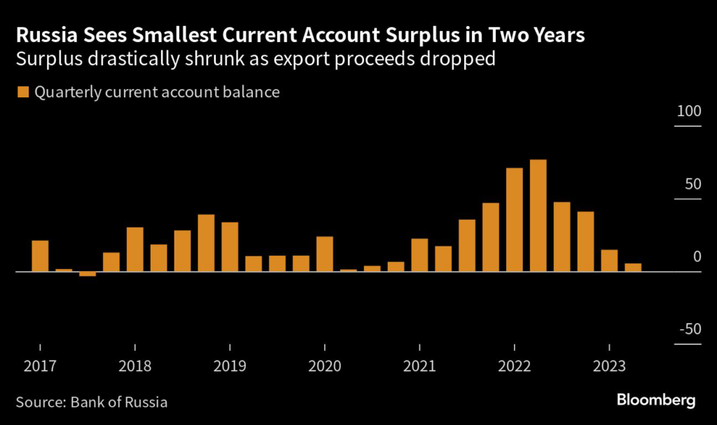 (Bloomberg) — Russia’s current-account surplus slumped in the second quarter from its peak a year earlier, reflecting a rapidly worsening trade situation that’s putting the ruble under pressure.