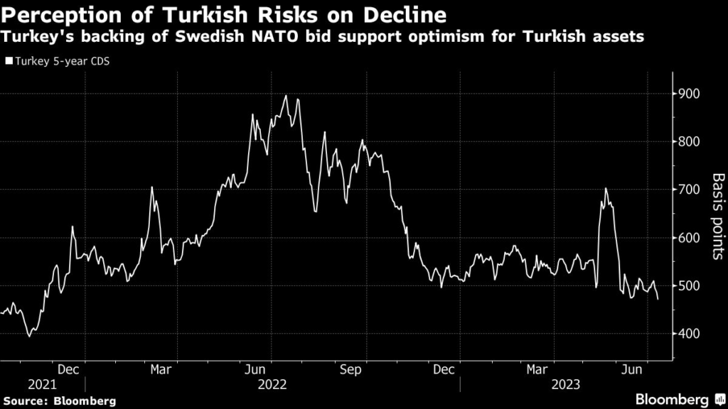 The cost of insuring Turkey’s bonds against default sunk after President Recep Tayyip Erdogan agreed to stop blocking Sweden’s bid to join the NATO military alliance, reducing geopolitical tensions weighing on the country.