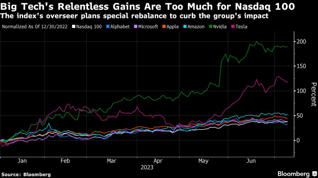 The rebalance is a consequence of the unstoppable rally in the six tech firms, an advance that’s mostly fueled by optimism over artificial intelligence.